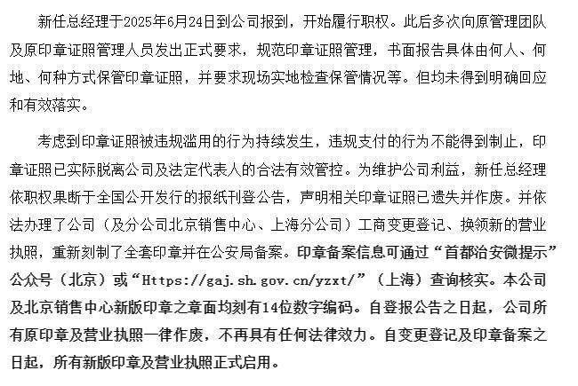 公开信称:“自登报公告之日起,公司所有原印章及营业执照一律作废,不再具有任何法律效力。自变更登记及印章备案之日起,所有新版印章及营业执照正式启用。”